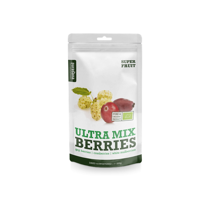 Το BIO Ultra Mix Berries είναι ένα vegan μείγμα από μούρα  βιολογικής καλλιέργειας. Περιέχει κράνμπερι, γκότζι μπέρι και μούρα, τα οποία είναι πλούσια σε βιταμίνες, μεταλλικά στοιχεία και άλλα υγιεινά συστατικά. Το μείγμα είναι ιδανικό για άτομα που θέλουν να υποστηρίξουν την υγεία και τη ζωτικότητά τους. Τα φρούτα που χρησιμοποιούνται είναι πλούσια σε φυτικές ίνες, κάτι που μπορεί να αποτελέσει έναν ακόμα λόγο για να συμπεριλάβετε το προϊόν στη διατροφή σας. Μπορείτε επίσης να το προσθέσετε σε γιαούρτι, σε τυρί cottage ή στο πρωινό σας πόριτζ. Επιπλέον, μπορείτε επίσης να το καταναλώσετε ως γρήγορο σνακ εάν έχετε καθυστερήσει και θέλετε να ικανοποιήσετε την επιθυμία σας για μια γλυκιά λιχουδιά.