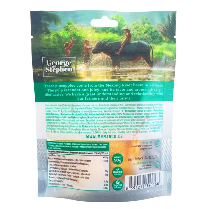 Το Mr. Pineapple είναι βιετναμέζικος ανανάς, από τις όχθες του ποταμού Μεκόνγκ σε αποξηραμένη μορφή. Πρόκειται για ένα πολύ διάσημο και δημοφιλές τροπικό φρούτο. Έχει μια λεπτή και ζουμερή σάρκα, με έντονη γλυκιά γεύση και άρωμα ανανά. Επιπλέον, είναι τέλειο ως γρήγορο σνακ ενώ μπορείτε να το προσθέσετε στο πόριτζ ή το μούσλι.
