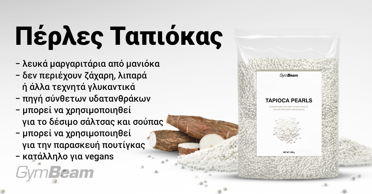 Οι Πέρλες Ταπιόκας είναι λευκές μπάλες από άμυλο κασάβας. Δεν περιέχουν γλουτένη και είναι κατάλληλες για vegan άτομα. Πρόκειται για μια εξαιρετική πηγή σύνθετων υδατανθράκων. Επιπλέον, δεν περιέχουν ζάχαρη, λίπος ή τεχνητά πρόσθετα. Δεν έχουν ιδιαίτερα έντονη γεύση και, ως εκ τούτου, είναι πολύ δημοφιλή ως πυκνωτικό για σάλτσες ή πουτίγκες.