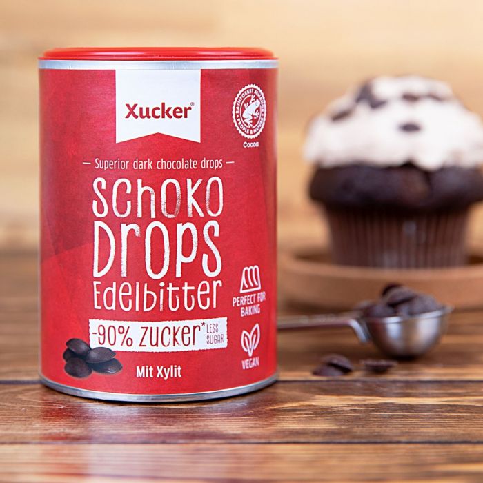 Οι Σταγόνες μαύρης σοκολάτας είναι κομμάτια μαύρης σοκολάτας χωρίς προσθήκη ζάχαρης, οι οποίες οφείλουν τη γλυκιά του γεύση μόνο στο φυσική γλυκαντική ουσία της Ξυλιτόλης. Είναι ιδανικές για το ψήσιμο μπισκότων, muffins, για την παρασκευή επικάλυψης σοκολάτας, σπιτικό μούσλι, αλλά είναι επίσης κατάλληλες για την ενίσχυση της γεύσης του πόριτζ ή του γιαουρτιού.